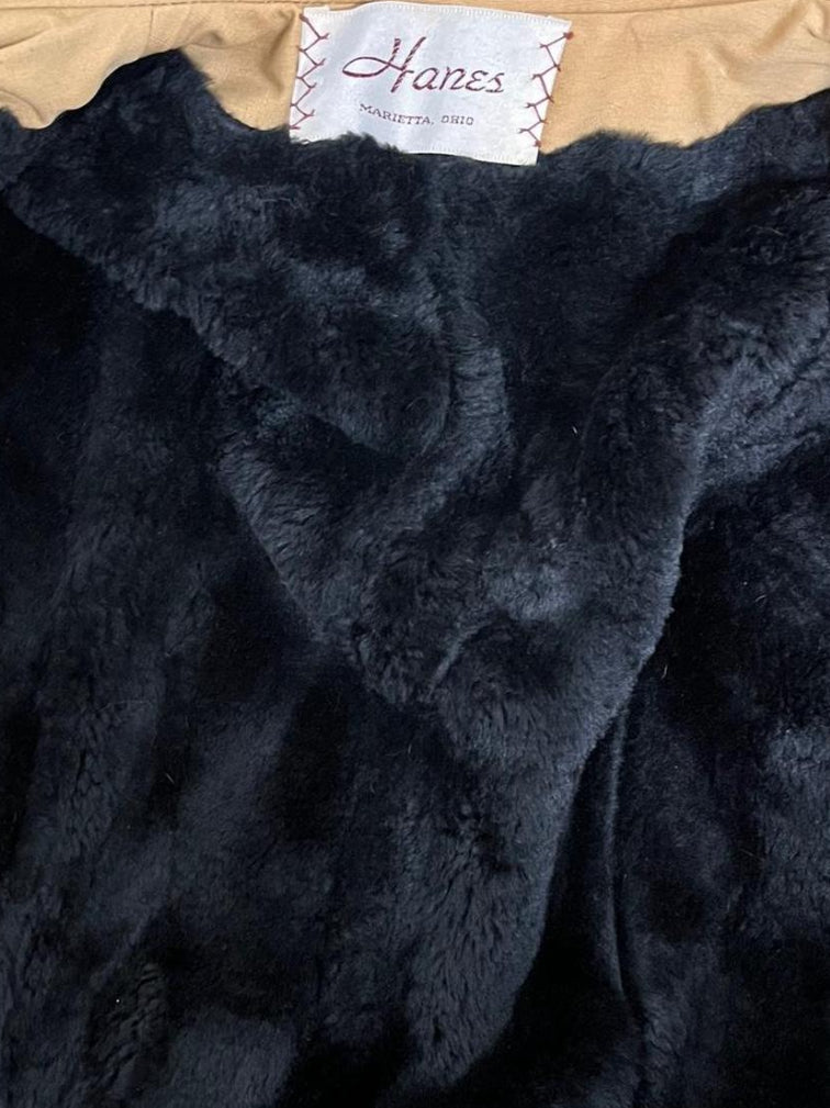 beautifully structured 1950s Hanes coat in durable tan canvas, finished with a soft faux fur collar and waist belt for a flattering, hourglass shape.