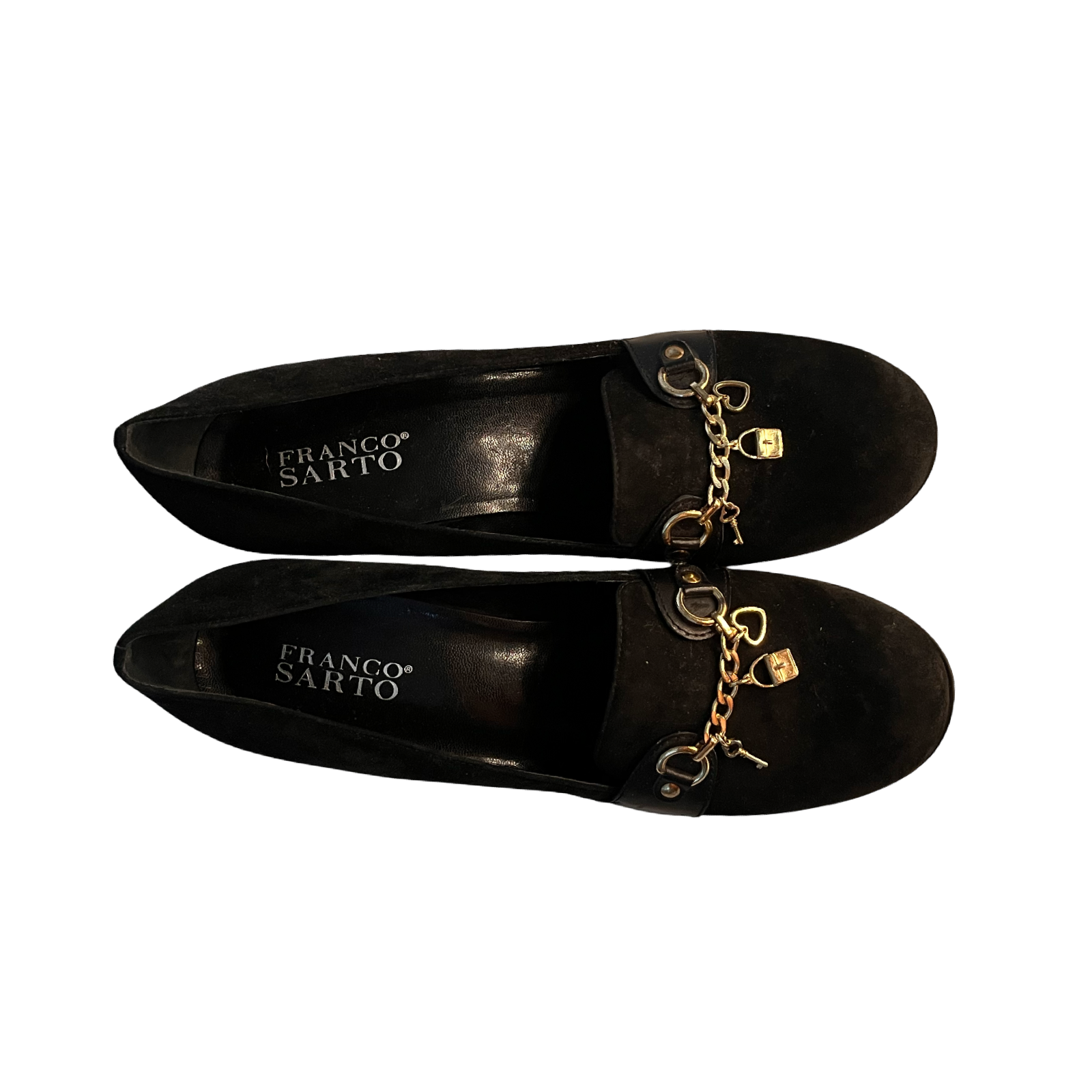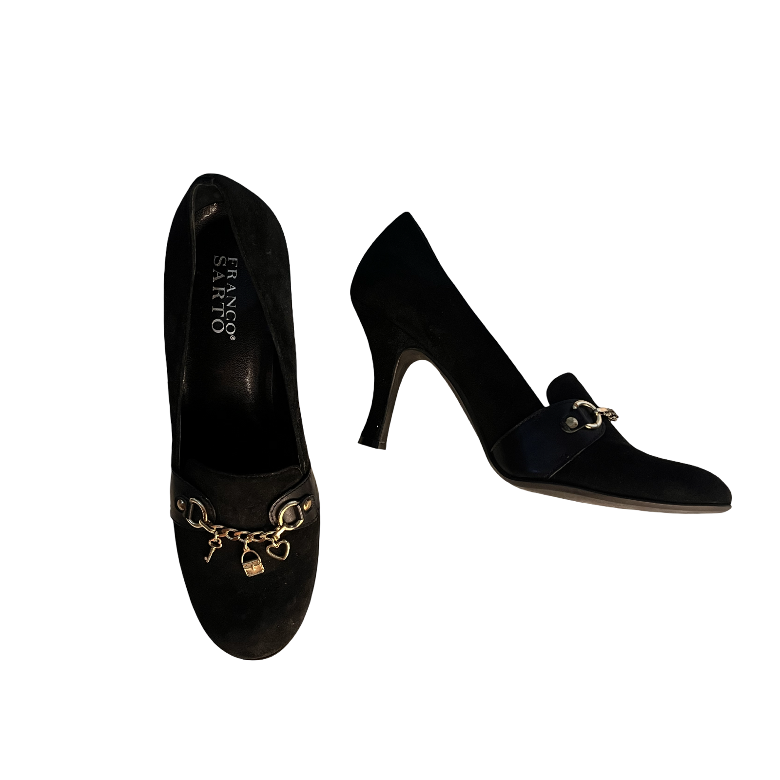 soft black suede pumps with delicate dangling charms. elegant, playful, and in excellent condition.