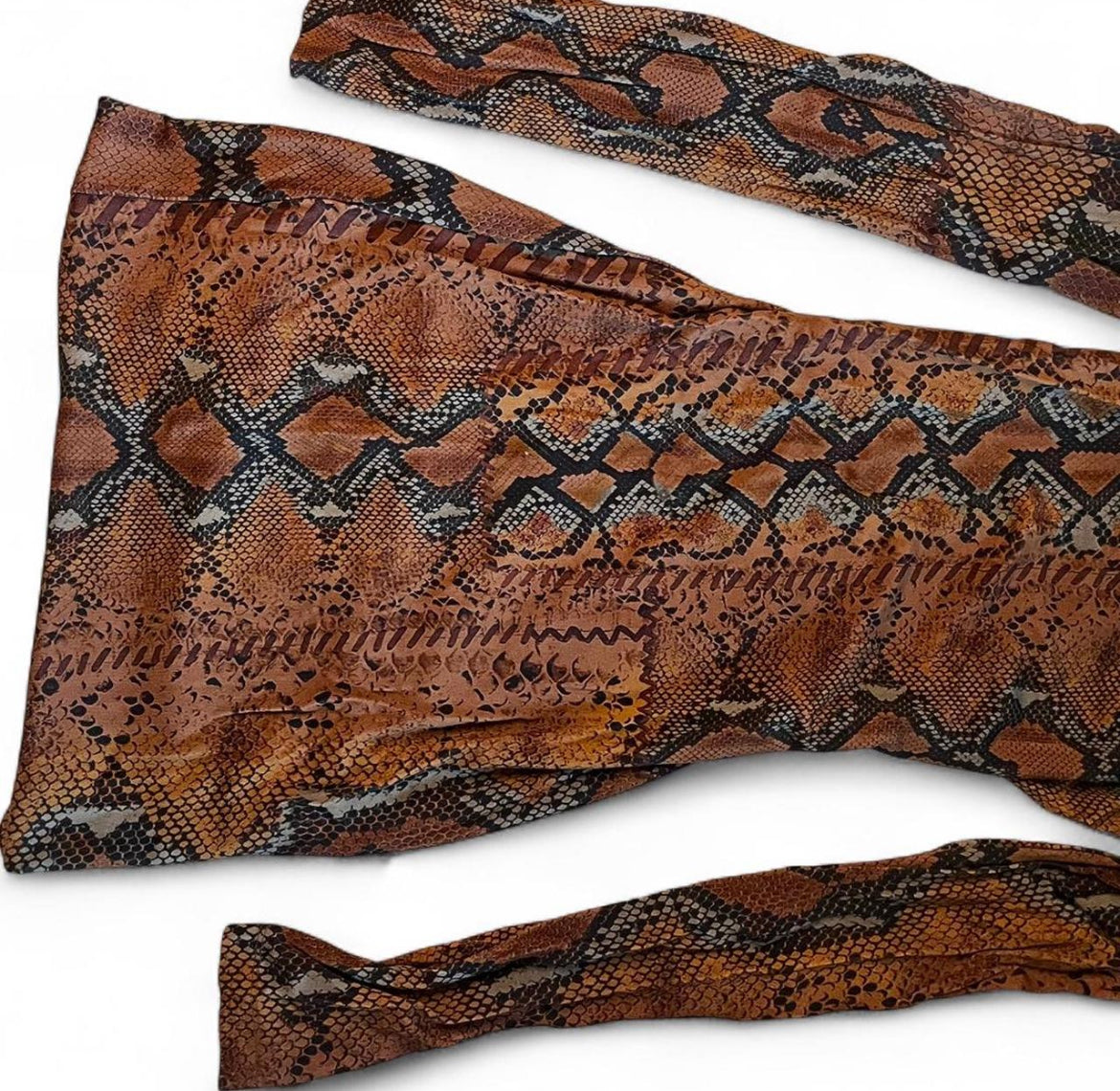 a slinky early 2000s Just Cavalli number. rich amber flecks and glimmers of electric aqua form a striking snakeskin print that catch light with every movement. perfect for the golden hour rooftop celebration that fades into a tipsy afterparty.