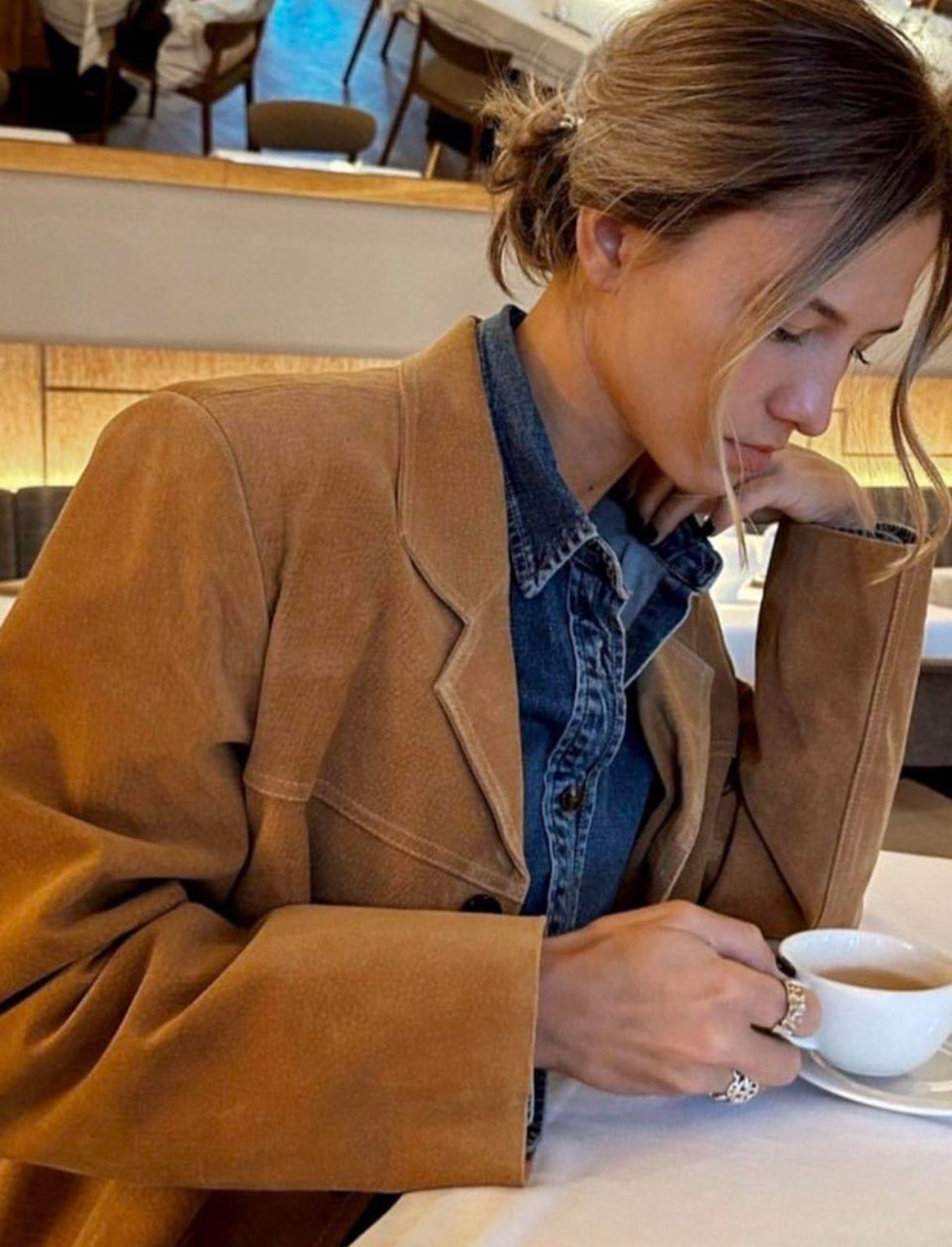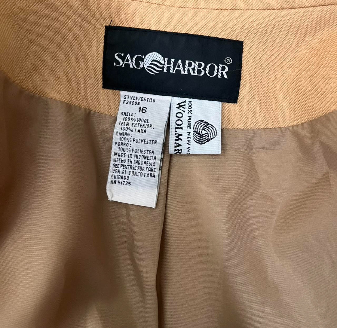 structured 1980s blazer in a light camel tan with distinctive saddle seams along the collar—an iconic detail of the era.