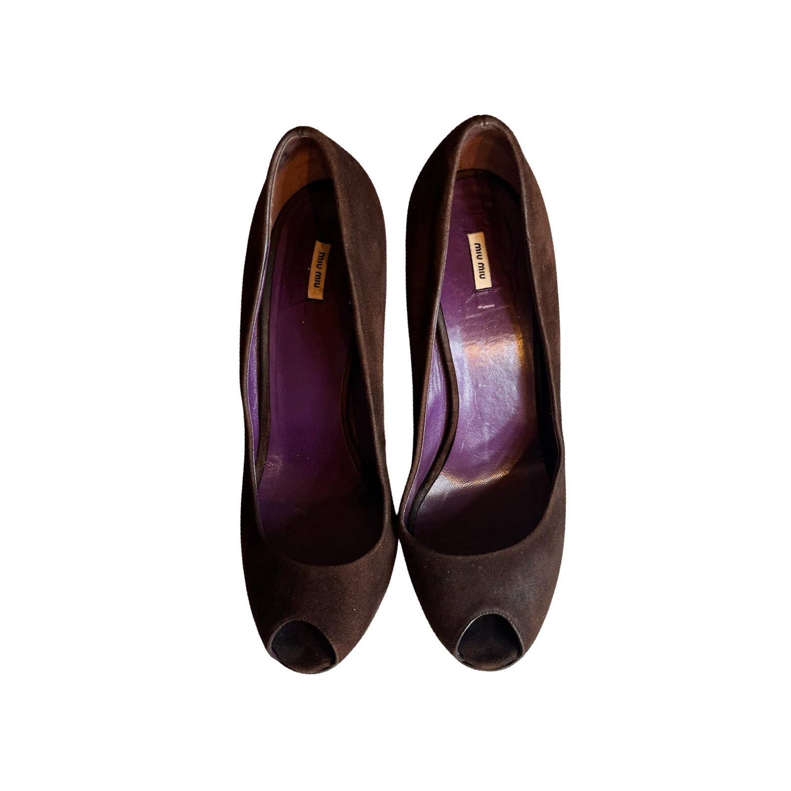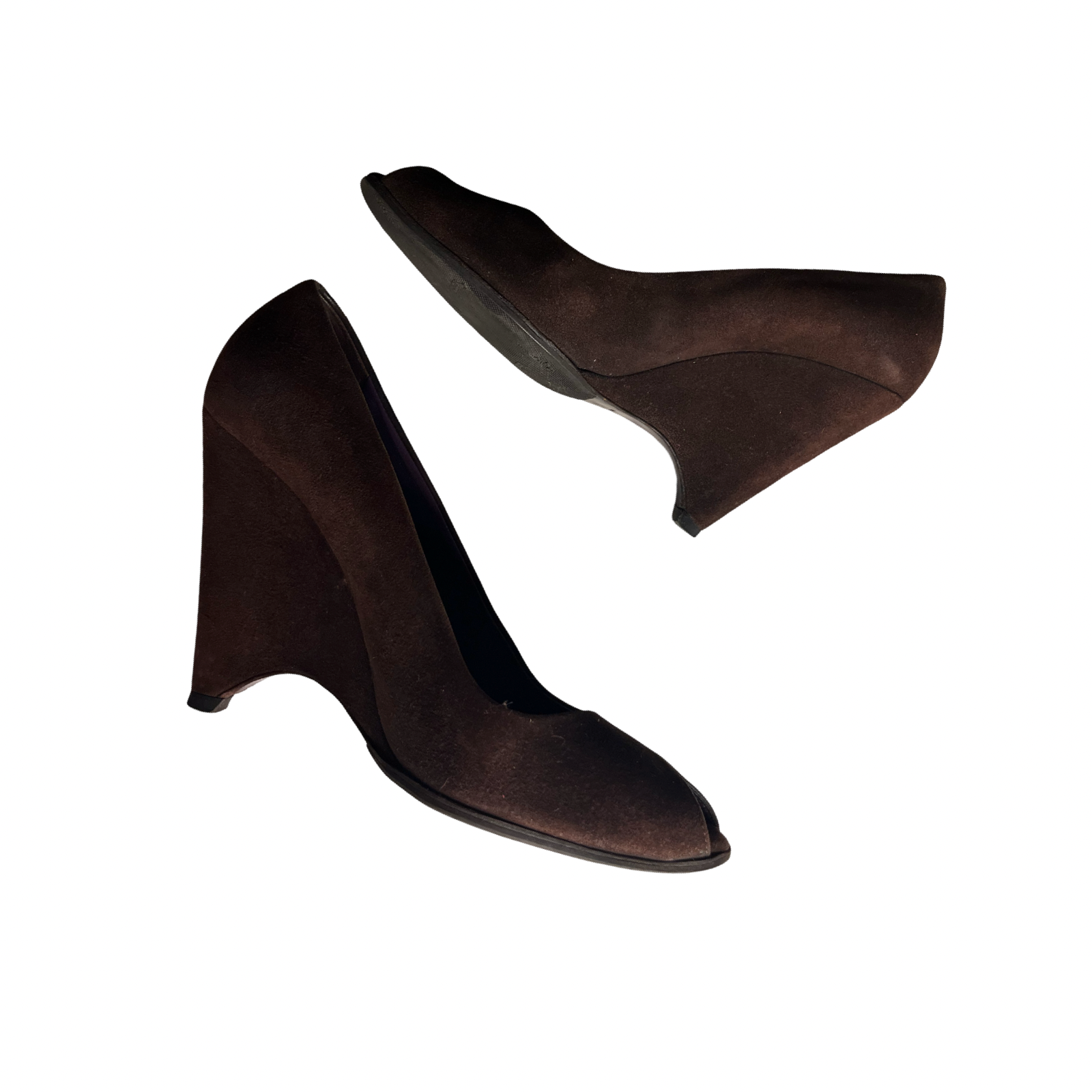 chocolate brown suede, peep toe, curved wedge heel, and smooth leather insole. size 40, fits like a 9.5–10. a textural, transitional staple with just enough edge.