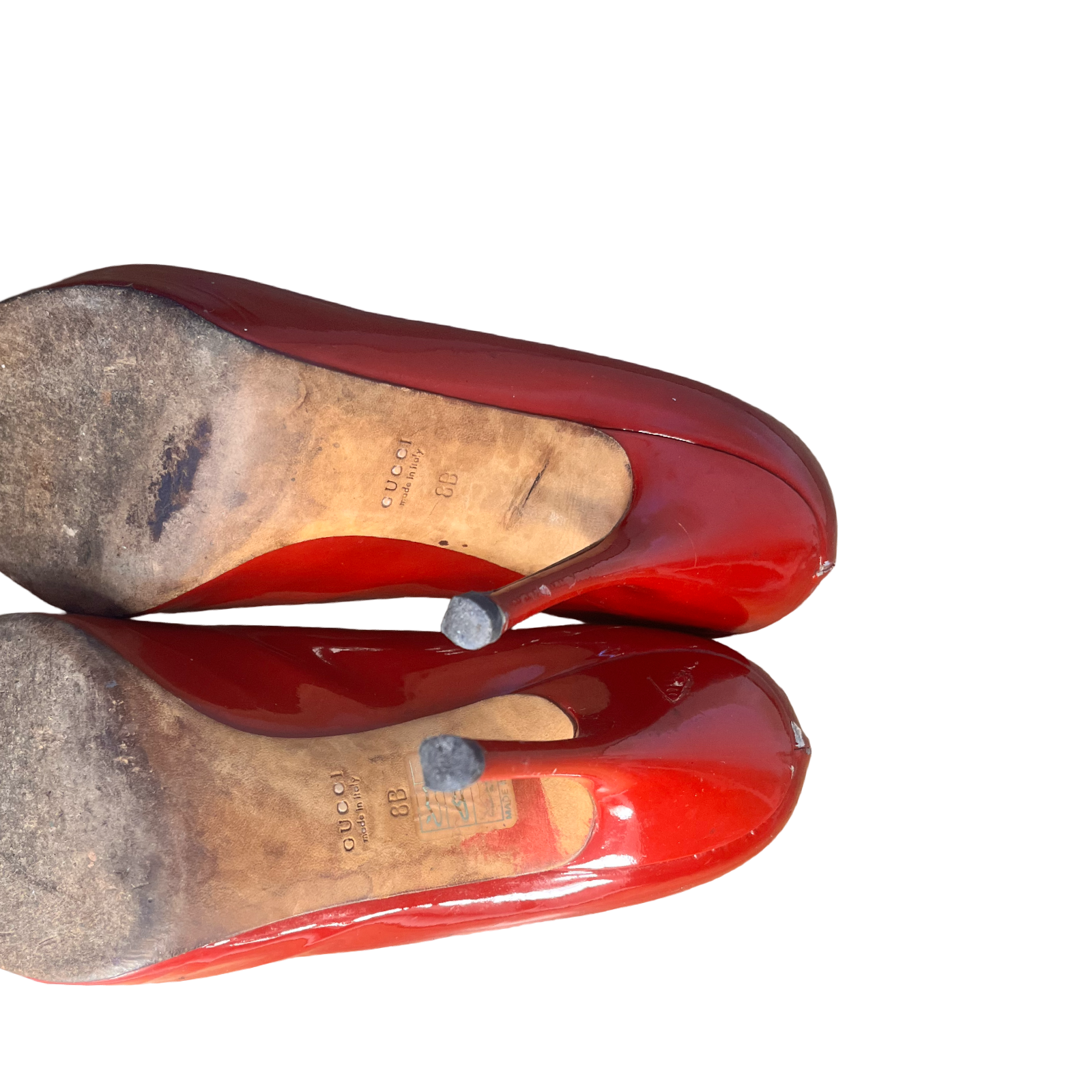 DESIGN DETAILS: striking blend of glossy red patent leather and second-hand antique Americana hardware, these vintage Gucci pumps balance sweetness with edge. the vintage Gucci typography blends beautifully with the antique strawberry detailing.