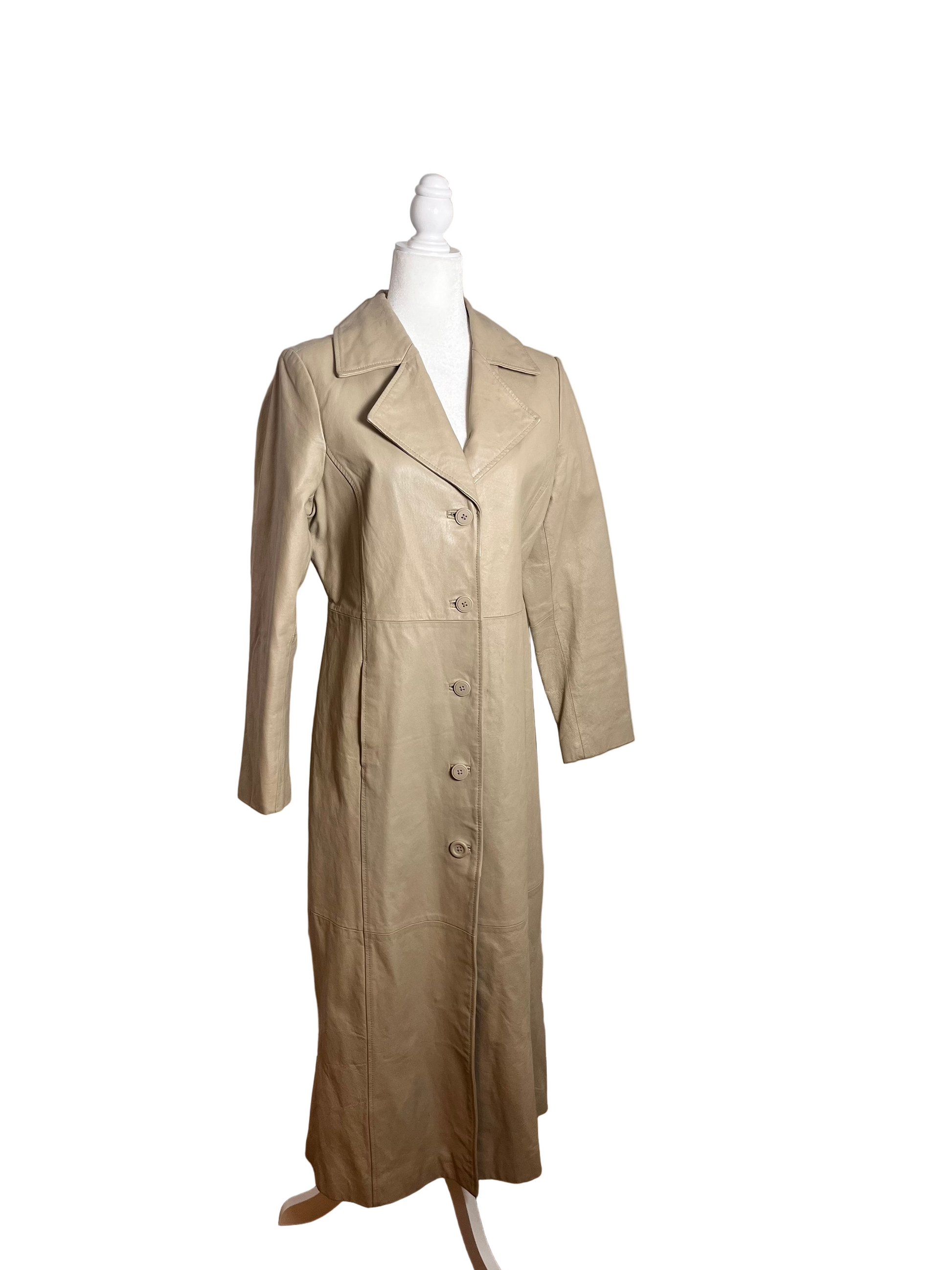 DESIGN: full-length 90s leather jacket in a rare light tan shade. sleek, timeless silhouette with effortless cool-girl edge.