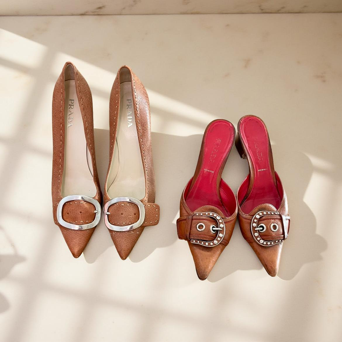 – One pair of designer heels (US 8.5) in brown leather with subtle Western elements